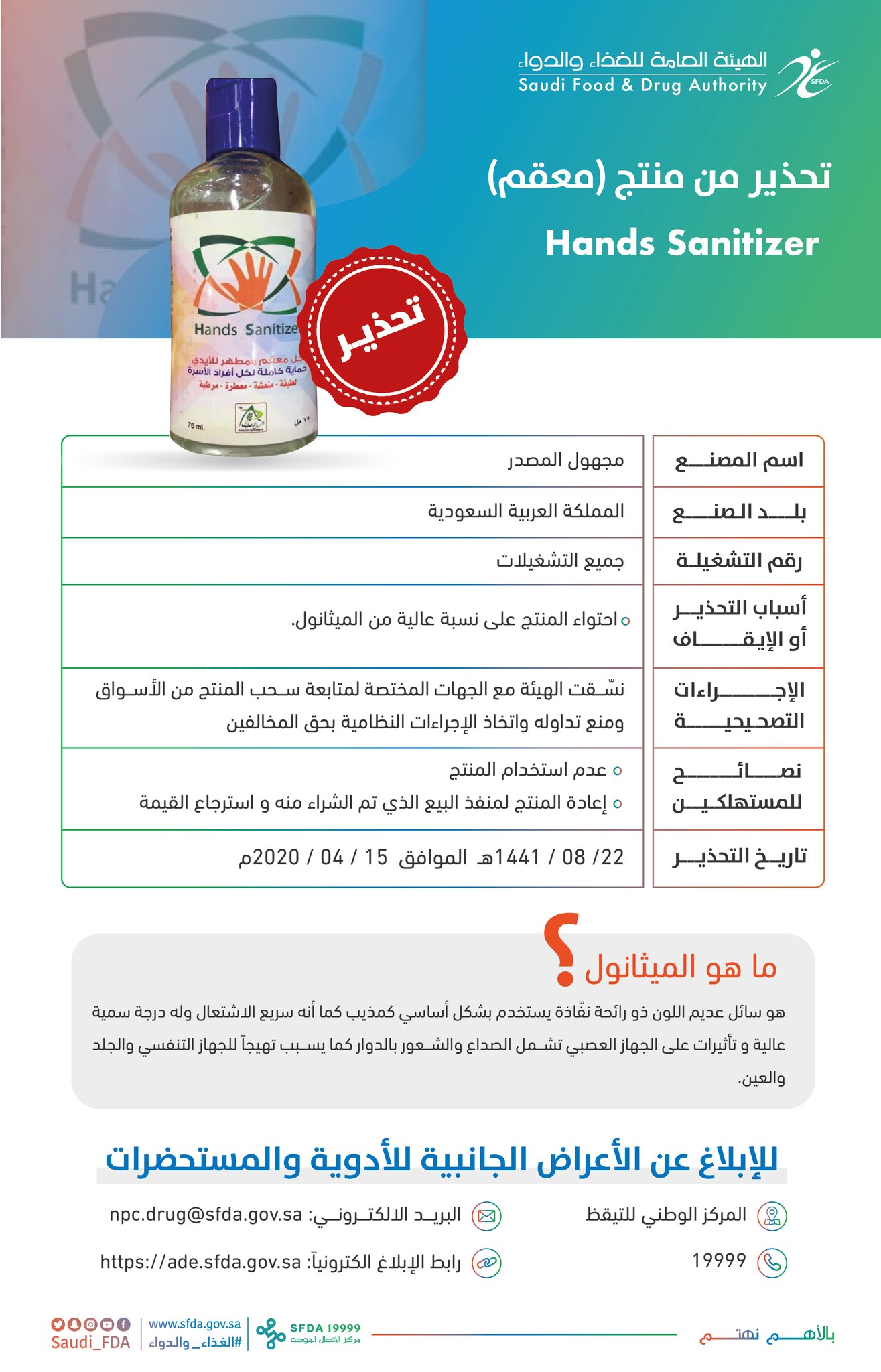 هيئة الغذاء والدواء On Twitter الغذاء والدواء تحذر من 3 أنواع من جل معقم اليدين لاحتوائها على نسبة عالية من الميثانول ونسبة أقل من الحد المسموح من مادتي الإيثانول والايزوبروبانول واتخذت الهيئة الإجراءات